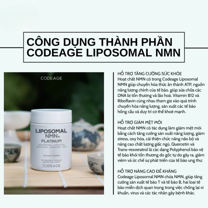 Liposomal NMN Platinum Codeage là dòng bổ sung NMN cao cấp được thiết kế để hỗ trợ trẻ hóa tế bào và tăng cường sinh lực tự nhiên mỗi ngày. Công thức sử dụng công nghệ bao liposome giúp tối ưu khả năng hấp thu, đưa dưỡng chất đi vào cơ thể một cách trọn vẹn và nhanh chóng. Sản phẩm giúp tăng mức NAD+, từ đó hỗ trợ cải thiện sức bền, nâng cao hiệu suất hoạt động và duy trì tinh thần minh mẫn trong suốt ngày dài. Phiên bản Platinum mang tiêu chuẩn tinh khiết và ổn định cao, phù hợp cho những ai muốn chăm sóc sức khỏe theo hướng khoa học và an toàn. Sản phẩm không chứa GMO, không gluten, không chất gây kích ứng, thích hợp dùng lâu dài để duy trì phong độ trẻ trung và sự dẻo dai của cơ thể.