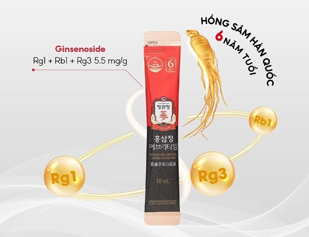 Tinh chất hồng sâm chứa nhiều hợp chất chống oxy hóa mạnh mẽ, giúp bảo vệ tế bào khỏi tác động của gốc tự do, nguyên nhân gây lão hóa sớm. Sử dụng nước hồng sâm KGC Everytime giúp duy trì làn da săn chắc, tăng độ đàn hồi và giảm nếp nhăn, đồng thời hỗ trợ chức năng não và giảm căng thẳng.