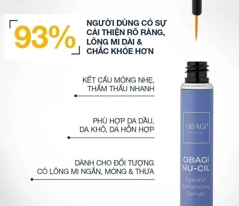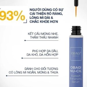 Serum dưỡng mi Obagi Nu-Cil Eyelash Enhancing Serum 3ml là dòng serum chăm sóc mi cao cấp giúp khơi dậy khả năng phát triển tự nhiên của từng sợi mi. Công thức NouriPlex™ – điểm nhấn công nghệ của Obagi – mang đến nguồn dưỡng chất tinh khiết hỗ trợ nuôi dưỡng chân mi, giúp hàng mi dần trở nên dài hơn, đậm nét hơn và khỏe bền theo thời gian. Kết cấu nhẹ mượt ôm sát theo đường mi, giúp dưỡng chất thấm nhanh mà không gây bết hay nặng mắt. Khi sử dụng liên tục, bạn sẽ thấy hàng mi mảnh yếu được cải thiện rõ rệt, hiện rõ độ cong mềm mại và vẻ dày dặn tự nhiên. Sản phẩm là gợi ý lý tưởng cho ai mong muốn sở hữu đôi mi nổi bật, đầy sức sống mà vẫn đảm bảo an toàn cho vùng da quanh mắt.