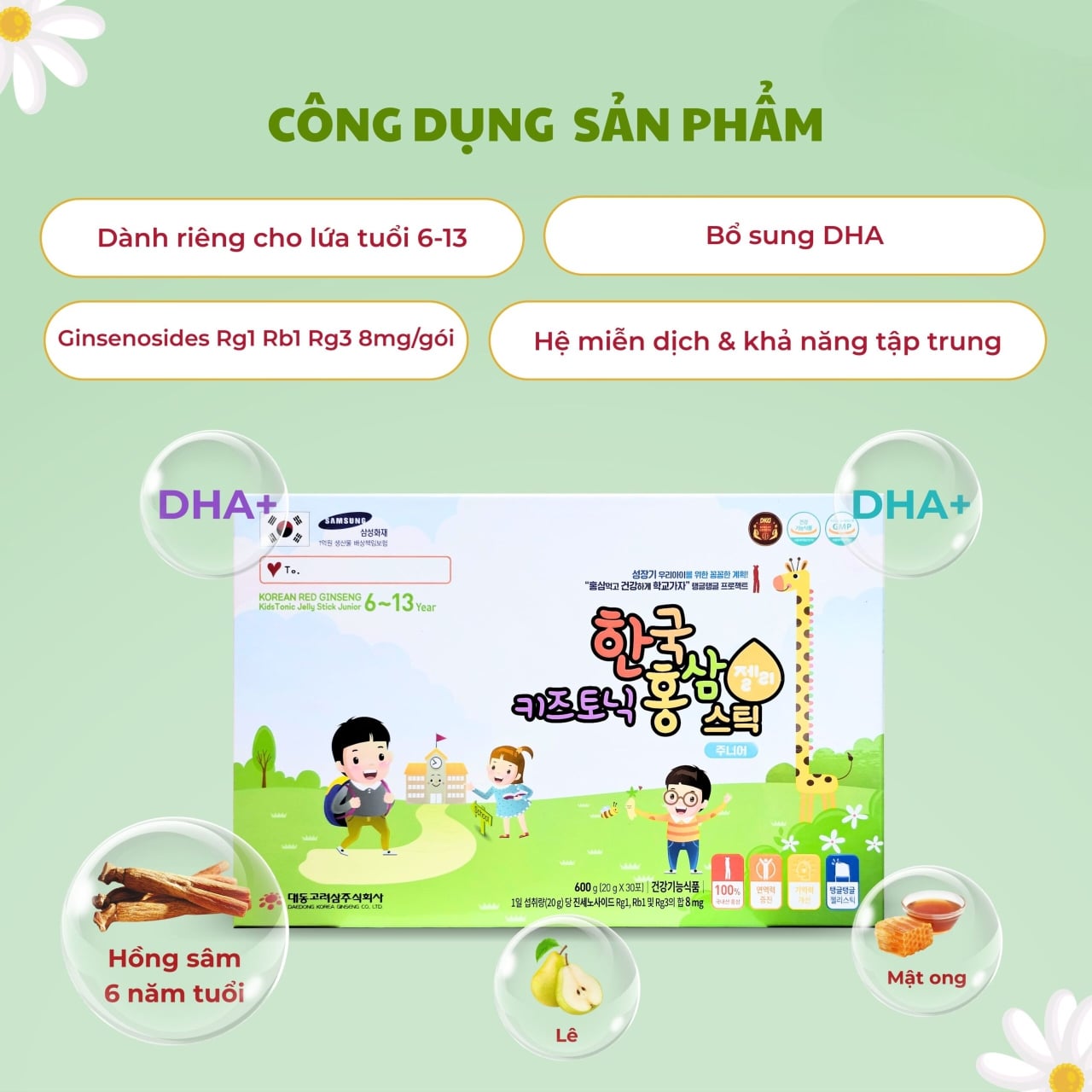 Giai đoạn từ 2 đến 13 tuổi là thời kỳ cơ thể trẻ phát triển mạnh mẽ cả về chiều cao lẫn cân nặng. Thạch hồng sâm trẻ em Daedong Junior hỗ trợ cung cấp dưỡng chất cần thiết cho quá trình này. Việc bổ sung hồng sâm giúp cơ thể trẻ có nền tảng thể chất ổn định. Công dụng này phù hợp với trẻ đang trong độ tuổi học tập và vận động nhiều. Khi thể chất được bồi bổ đúng cách, quá trình tăng trưởng diễn ra thuận lợi hơn. Đây là lựa chọn hỗ trợ phát triển lâu dài cho trẻ.