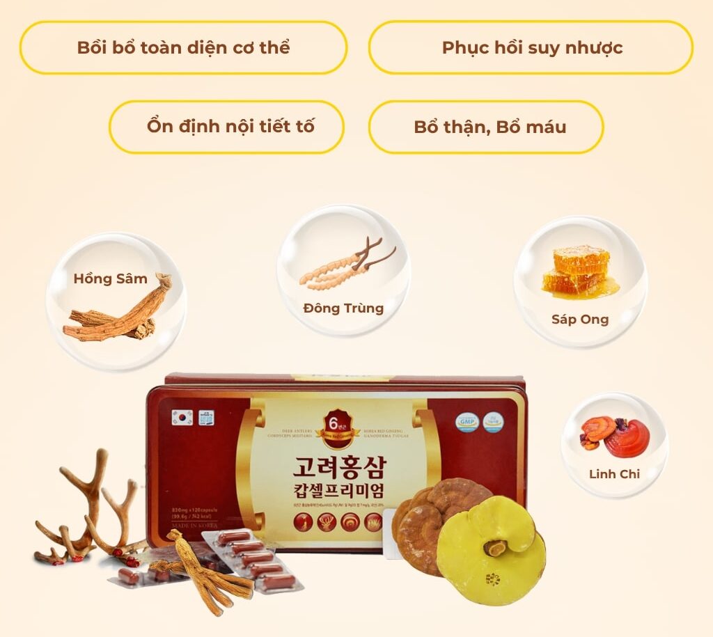 Hồng sâm là thành phần cốt lõi trong sản phẩm, được chọn lọc từ những củ sâm chất lượng cao. Quá trình chế biến giúp giữ lại hàm lượng saponin quý giá, hỗ trợ bồi bổ cơ thể toàn diện. Hồng sâm góp phần cải thiện tuần hoàn máu, tăng cường năng lượng và sức bền. Thành phần này phù hợp với nhiều đối tượng nhờ khả năng thích nghi tốt với cơ địa. Việc sử dụng hồng sâm lâu dài giúp duy trì thể trạng ổn định và khỏe mạnh.