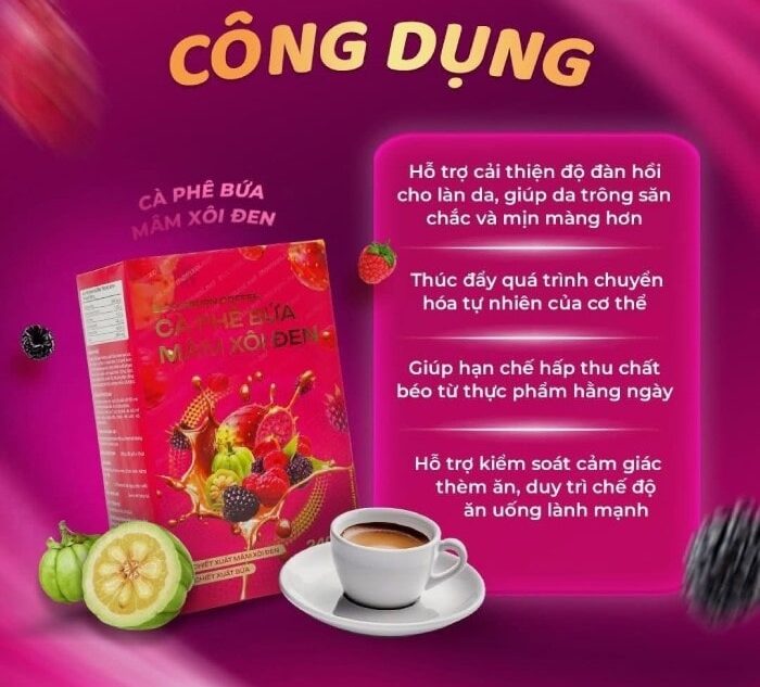 Mâm xôi đen giàu chất chống oxy hóa giúp bảo vệ tế bào da khỏi lão hóa và tác hại của môi trường. Khi kết hợp với bứa, sản phẩm hỗ trợ thanh lọc cơ thể, giảm độc tố và làm chậm quá trình hình thành nếp nhăn. Da trở nên săn chắc, sáng khỏe và mịn màng hơn theo thời gian. Ngoài ra, tình trạng mụn hay da xỉn màu cũng được cải thiện nhờ cơ chế giải độc tự nhiên từ các thành phần trong cà phê.