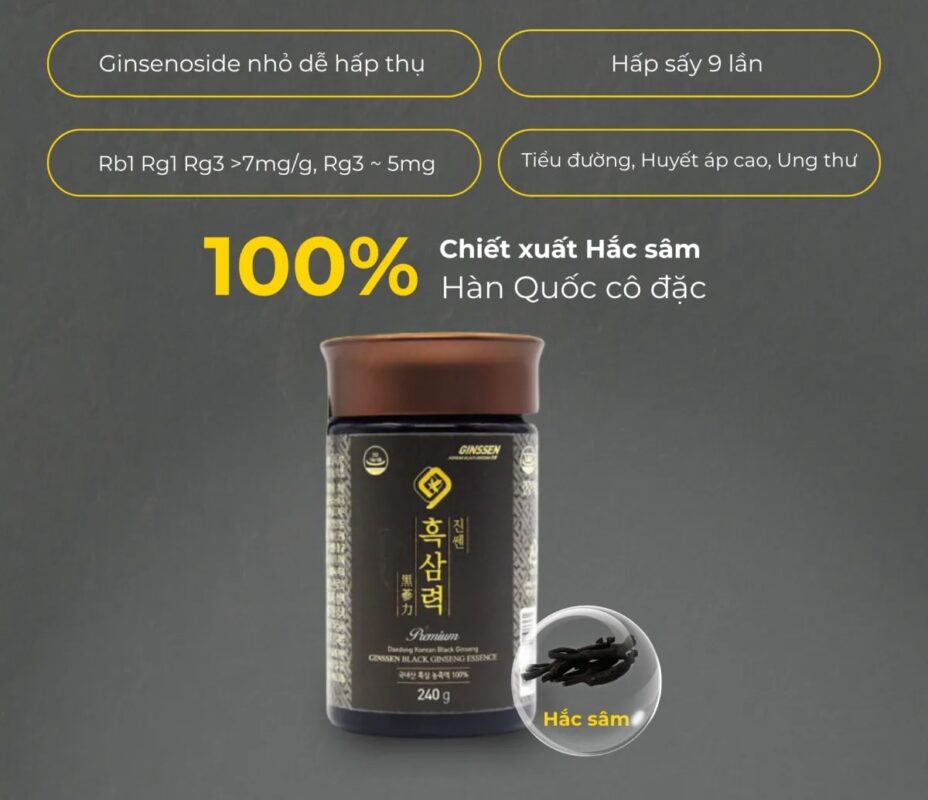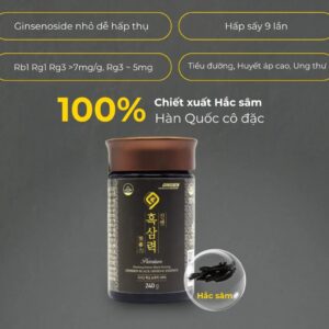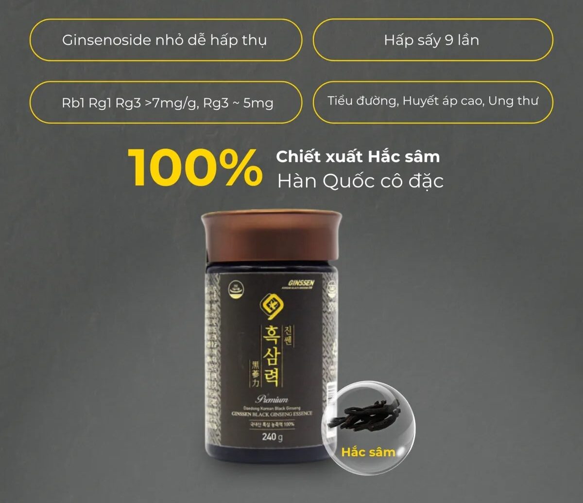Hắc sâm 6 năm tuổi được chọn lọc từ hồng sâm chất lượng cao, trải qua quá trình hấp nhiều lần để tạo thành tinh chất cô đặc. Đây là thành phần chính chứa hàm lượng saponin cao, giúp cải thiện miễn dịch, tăng năng lượng và nâng cao sức khỏe tổng thể. Hắc sâm còn hỗ trợ tuần hoàn máu, tăng trí lực, sinh lực và chống oxy hóa mạnh mẽ. Công nghệ chế biến đặc biệt giúp giữ lại tối đa dưỡng chất, đảm bảo hiệu quả toàn diện cho cơ thể.