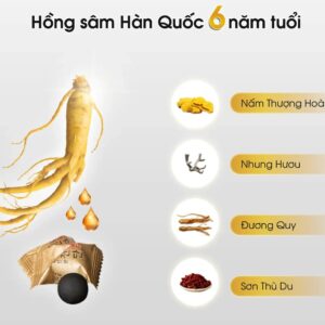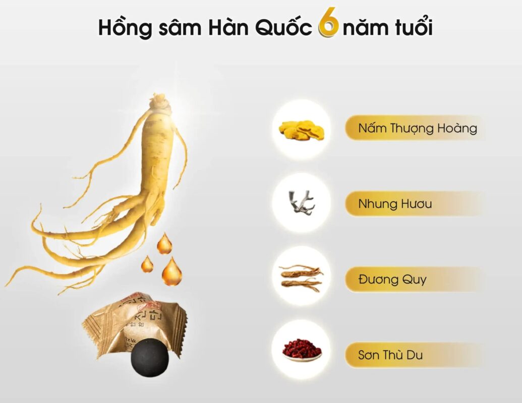 Hồng sâm 6 năm tuổi là thành phần chính, chứa hàm lượng ginsenoside cao giúp tăng cường năng lượng, sức đề kháng và hỗ trợ tuần hoàn máu. Sâm được chế biến theo quy trình truyền thống Hàn Quốc để giữ trọn vẹn dược chất, nâng cao hiệu quả sinh học.
