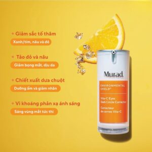 Kem làm mờ quầng thâm mắt Murad Vita-C Eyes Dark Circle Corrector 15ml là giải pháp chăm sóc vùng da mắt chuyên sâu, giúp cải thiện rõ rệt tình trạng thâm sạm và da xỉn màu quanh mắt. Sản phẩm ứng dụng dẫn xuất vitamin C ổn định kết hợp công nghệ hiệu chỉnh màu thông minh, giúp làm sáng tức thì và đều màu da tự nhiên. Kết cấu kem mỏng nhẹ, thẩm thấu nhanh, không gây nặng mắt hay vón cục khi trang điểm. Murad Vita-C Eyes còn hỗ trợ làm mịn bề mặt da, giảm dấu hiệu mệt mỏi và giúp đôi mắt trông tươi tắn, rạng rỡ hơn mỗi ngày. Phù hợp cho người thường xuyên thức khuya, làm việc với màn hình hoặc có quầng thâm lâu năm.