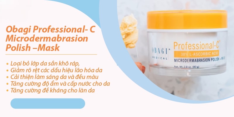 Mặt nạ Obagi Professional-C Microdermabrasion Polish + Mask 80g là bước chăm da nâng cấp, kết hợp khả năng làm mịn bề mặt và nuôi dưỡng sáng khỏe trong cùng một công thức. Các hạt tinh thể siêu nhỏ nhẹ nhàng loại bỏ lớp da tối màu, giúp bề mặt da tươi mới và mềm mượt hơn. Khi chuyển sang giai đoạn ủ dưỡng, vitamin C hàm lượng cao thẩm thấu mạnh mẽ, hỗ trợ tái tạo độ rạng rỡ tự nhiên và cải thiện sắc da không đều. Kết cấu đậm dưỡng tạo cảm giác da căng sáng, đầy sức sống sau mỗi lần sử dụng. Sản phẩm tạo nên cảm giác bừng sáng rõ rệt, làn da trông khỏe khoắn, rạng rỡ và giàu sức sống chỉ sau thời gian ngắn sử dụng.