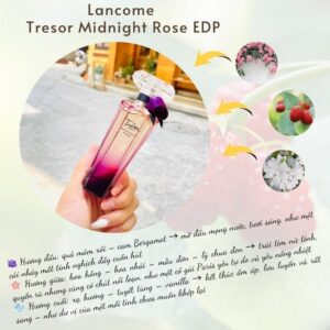 Nước hoa Lancôme Tresor Midnight Rose 75ml là mùi hương dành cho những cô gái yêu nét ngọt ngào hiện đại pha chút bí ẩn đầy lôi cuốn. Ngay từ lần xịt đầu tiên, hương mâm xôi tươi mọng lan tỏa sống động, mang lại cảm giác trẻ trung và đầy năng lượng. Tiếp nối là tầng hương hoa hồng mềm mại, nữ tính nhưng không quá cổ điển, tạo nên sự cân bằng hài hòa giữa lãng mạn và cá tính. Lớp hương cuối với vani ấm áp kết hợp cùng gỗ tuyết tùng giúp tổng thể mùi hương trở nên sâu lắng, quyến rũ và lưu hương bền bỉ suốt nhiều giờ. Mùi hương có độ tỏa vừa phải, phù hợp sử dụng hằng ngày lẫn những buổi tối hẹn hò hay sự kiện đặc biệt.
