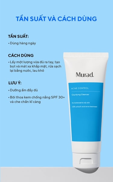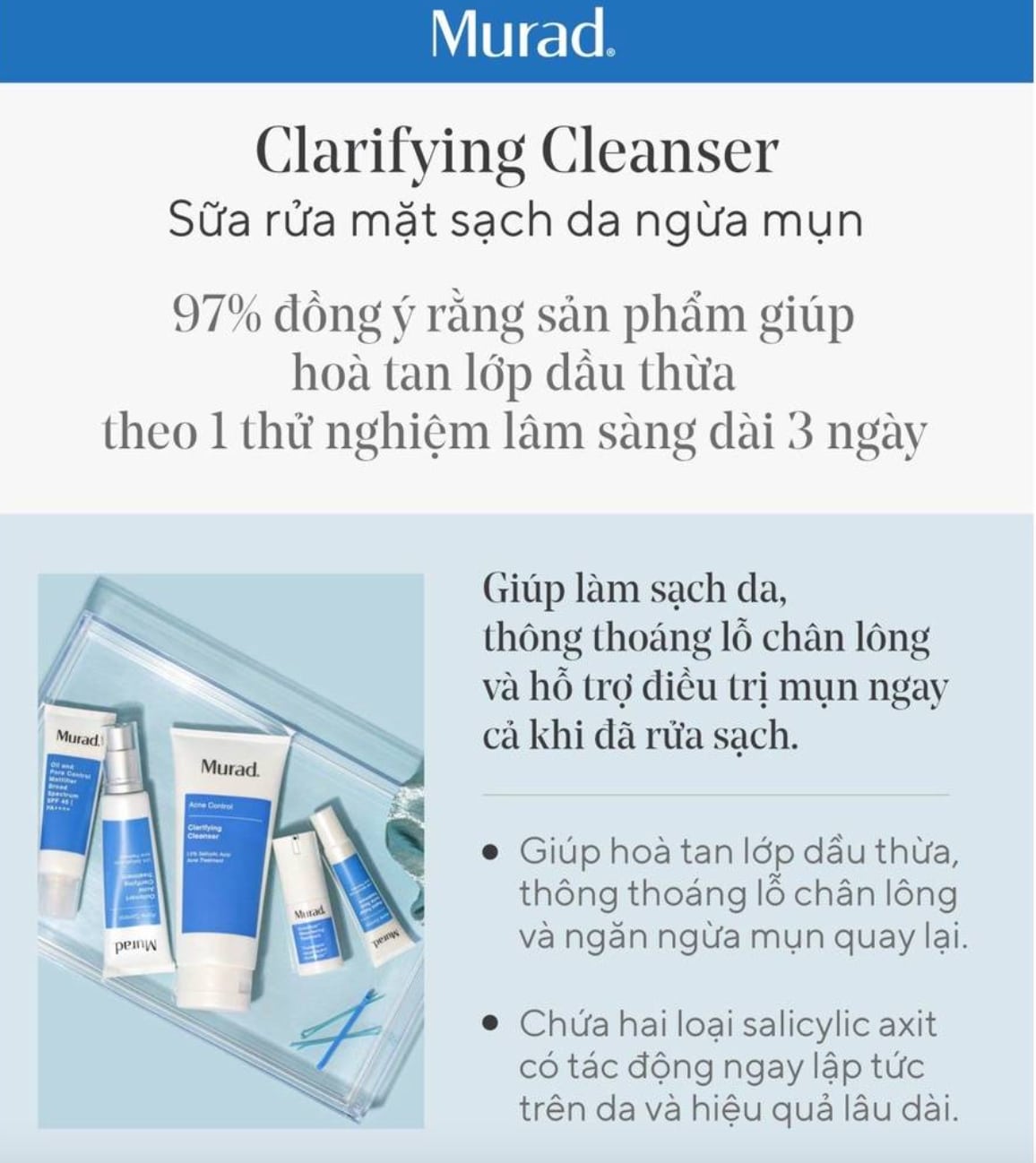 Murad Clarifying Cleanser được thiết kế đặc biệt cho làn da dễ nổi mụn, giúp ngăn ngừa và giảm thiểu sự xuất hiện của mụn trứng cá và mụn ẩn. Công thức chứa các hoạt chất làm sạch sâu, loại bỏ bụi bẩn, dầu thừa và tế bào chết tích tụ trong lỗ chân lông.