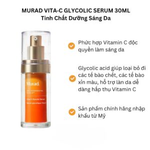 Tinh chất làm sáng da Murad Vita-C Glycolic Serum 30ml là giải pháp chăm sóc da chuyên sâu dành cho làn da xỉn màu, thô ráp và thiếu độ rạng rỡ. Sản phẩm ứng dụng Vitamin C thế hệ mới kết hợp cùng Glycolic Acid hoạt tính, hỗ trợ loại bỏ tế bào da cũ, từ đó giúp bề mặt da trở nên tươi sáng và đều màu hơn. Công thức được nghiên cứu theo chuẩn da liễu, giúp cải thiện sắc da một cách rõ rệt mà vẫn duy trì cảm giác dễ chịu khi sử dụng. Kết cấu serum lỏng nhẹ, thấm nhanh, không gây nhờn rít, phù hợp cho cả quy trình dưỡng da ban ngày lẫn ban đêm. Khi sử dụng đều đặn, làn da trông mịn màng hơn, trong trẻo hơn và tràn đầy sức sống.
