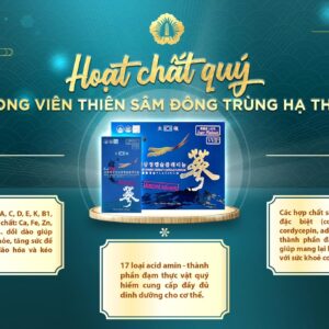 Đông trùng hạ thảo là dược liệu quý, được sử dụng phổ biến trong các sản phẩm bồi bổ cao cấp. Thành phần này hỗ trợ tăng cường sức đề kháng và nâng cao thể lực tự nhiên. Đông trùng hạ thảo còn giúp cơ thể hấp thu dưỡng chất tốt hơn. Việc kết hợp đông trùng hạ thảo với thiên sâm tạo nên công thức cân bằng và hiệu quả. Đây là thành phần quan trọng giúp sản phẩm được đánh giá cao. Hàm lượng được nghiên cứu phù hợp cho việc sử dụng hàng ngày.