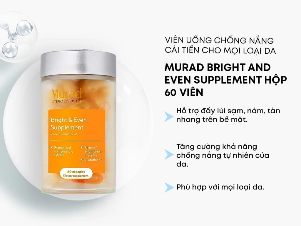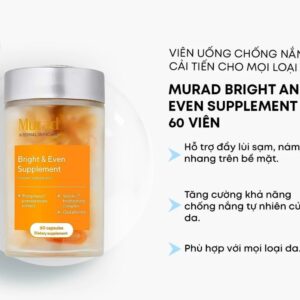 Viên uống chống nắng Murad Pomphenol Sunguard là giải pháp bảo vệ da từ bên trong, hỗ trợ giảm tác hại của tia UV và các yếu tố ô nhiễm môi trường. Công thức chứa chiết xuất lựu giàu polyphenol cùng vitamin và khoáng chất giúp trung hòa gốc tự do, tăng cường sức đề kháng tự nhiên cho làn da. Sản phẩm hỗ trợ hạn chế sạm nám, lão hóa sớm do nắng, đồng thời góp phần duy trì làn da tươi sáng, đều màu hơn mỗi ngày. Viên uống dễ sử dụng, phù hợp với người thường xuyên tiếp xúc ánh nắng hoặc làm việc ngoài trời. Murad Pomphenol Sunguard là lựa chọn lý tưởng kết hợp cùng kem chống nắng để nâng cao hiệu quả bảo vệ da toàn diện.