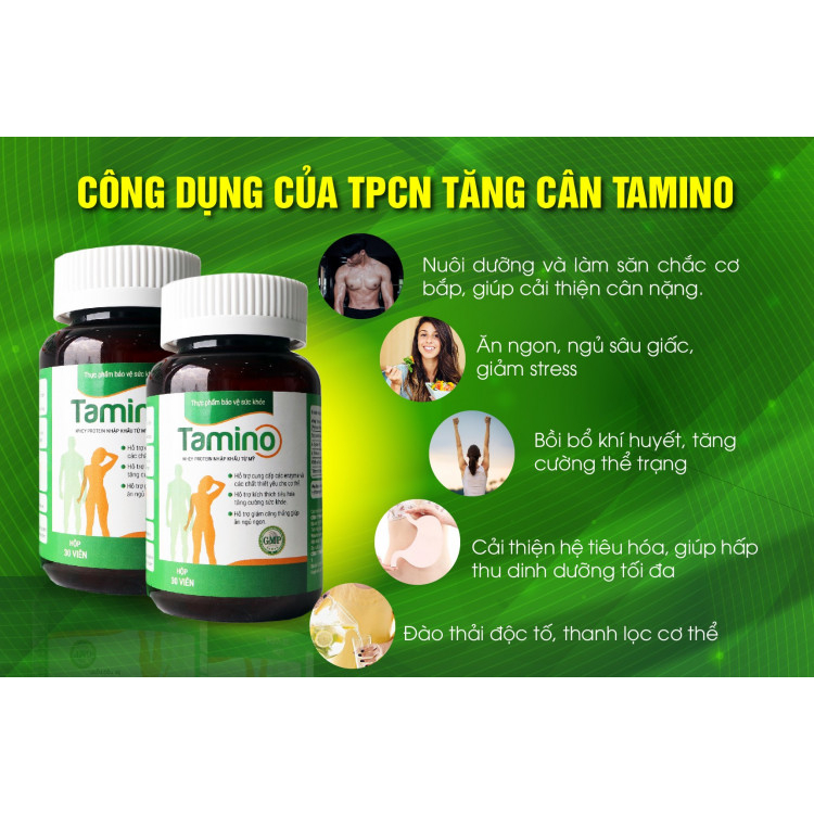 - Hỗ trợ tăng cân hiệu quả: Tamino giúp người dùng tăng cân an toàn và tự nhiên mà không gây tích mỡ thừa, nhờ vào việc thúc đẩy tăng cường khối cơ và cung cấp các dưỡng chất thiết yếu để cơ thể phát triển khỏe mạnh. Sản phẩm không chỉ tăng cân mà còn giúp cơ thể trở nên săn chắc và khỏe mạnh hơn.
