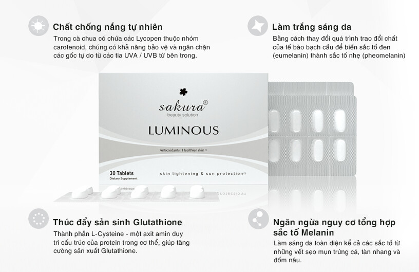 Viên uống trắng da cà chua Sakura Luminous được phát triển theo hướng chăm sóc sắc da từ gốc, tập trung cải thiện tình trạng da tối màu, kém tươi sáng do nắng và môi trường. Sản phẩm ứng dụng chiết xuất cà chua giàu Lycopene kết hợp L-Glutathione cùng nhóm vitamin chống oxy hóa, giúp hỗ trợ làm sáng da tự nhiên và duy trì độ đều màu. Công thức viên uống phù hợp sử dụng hằng ngày, góp phần bảo vệ da trước tác động của tia UV và quá trình oxy hóa. Kiên trì sử dụng giúp làn da trông trong trẻo hơn, rạng rỡ và khỏe mạnh từ bên trong. Sakura Luminous là giải pháp được nhiều người lựa chọn khi muốn nâng tông da an toàn, không gây bào mòn.