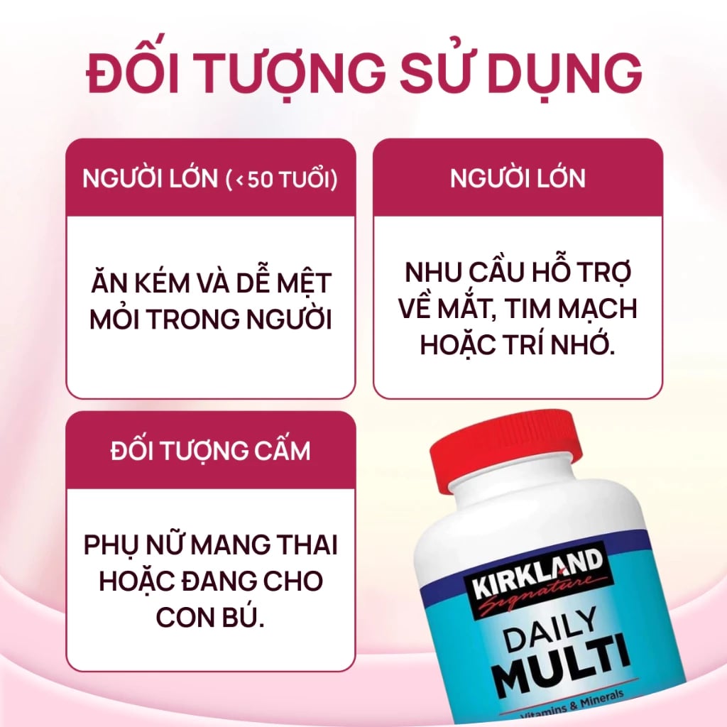 Viên uống Vitamin tổng hợp Kirkland Daily Multi được xây dựng với công thức cân bằng nhiều loại vitamin và khoáng chất thiết yếu, giúp bù đắp lượng vi chất thiếu hụt trong chế độ ăn uống hằng ngày. Việc bổ sung đều đặn giúp cơ thể duy trì năng lượng ổn định, hạn chế tình trạng mệt mỏi kéo dài do thiếu vitamin.
