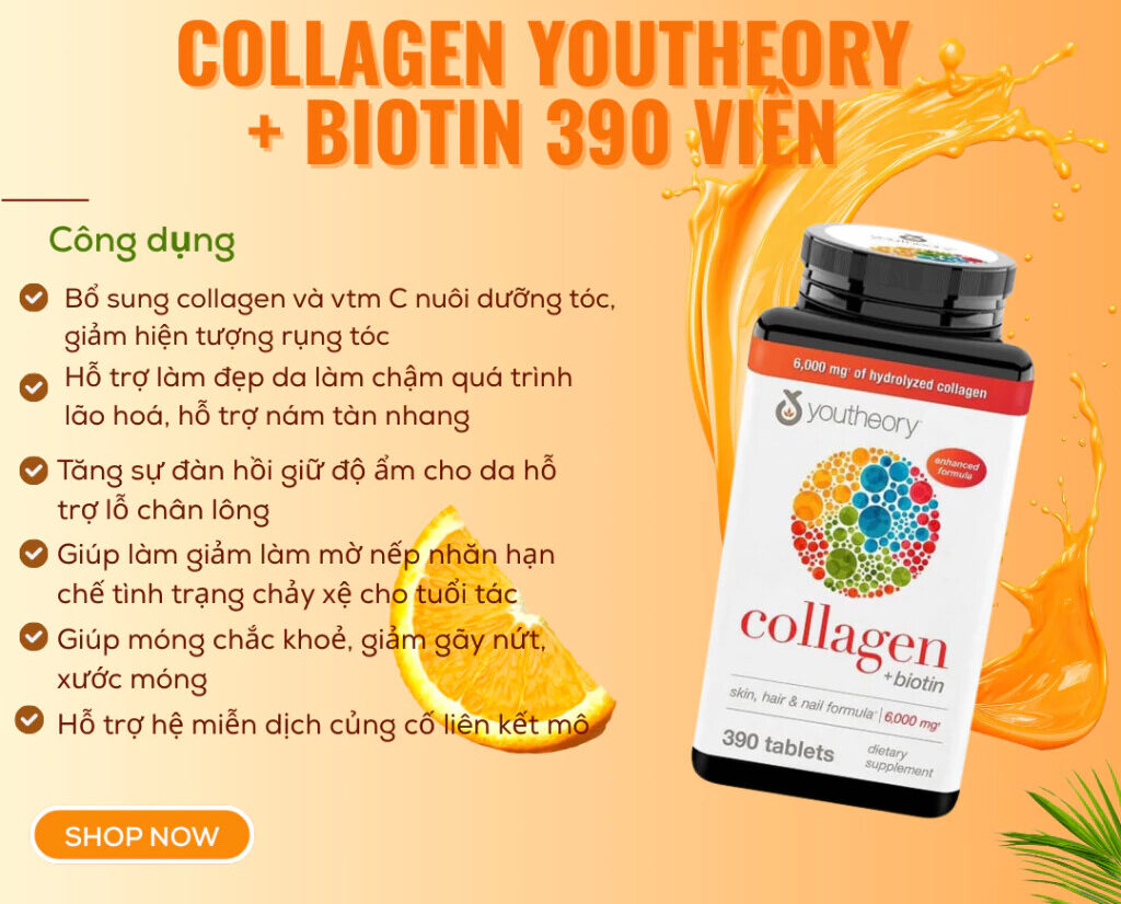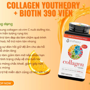 Viên uống Youtheory Collagen Type 1, 2 & 3 + Biotin 390 viên là giải pháp bổ sung collagen toàn diện, được nhiều người tin dùng để chăm sóc da, tóc và hệ xương khớp từ bên trong. Công thức kết hợp 3 loại collagen quan trọng (Type 1, 2 & 3) cùng Biotin hàm lượng cao giúp hỗ trợ da săn chắc, giảm nếp nhăn, tóc chắc khỏe và móng ít gãy rụng. Sản phẩm được sản xuất tại Mỹ, không chứa gluten, không biến đổi gen (Non-GMO), phù hợp cho người trưởng thành có nhu cầu làm đẹp và tăng cường sức khỏe lâu dài. Với 390 viên tiện lợi, Youtheory Collagen là lựa chọn kinh tế cho liệu trình sử dụng đều đặn mỗi ngày, giúp duy trì vẻ ngoài tươi trẻ và cơ thể dẻo dai theo thời gian.